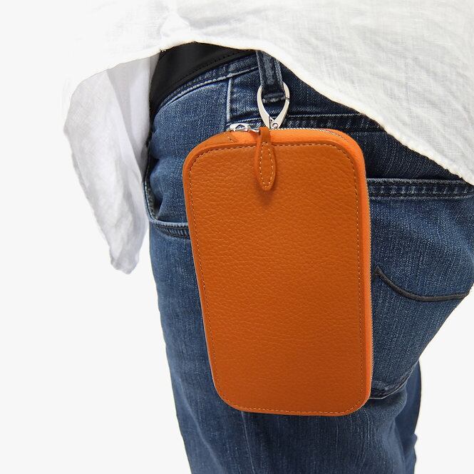 持ち方も様々なスタイル、シーンにご対応出来ます様、①首から下げてお持ち頂く“ネックポーチ”仕様②ベルトループに装着頂ける“ベルトポーチ”仕様③ストラップの丸カンをナスカンに付け、短くし、手首に巻き付けられる“ハンドポーチ”仕様。の3way仕様になっております。更に、鞄等に付けてもお持ち頂けます。
