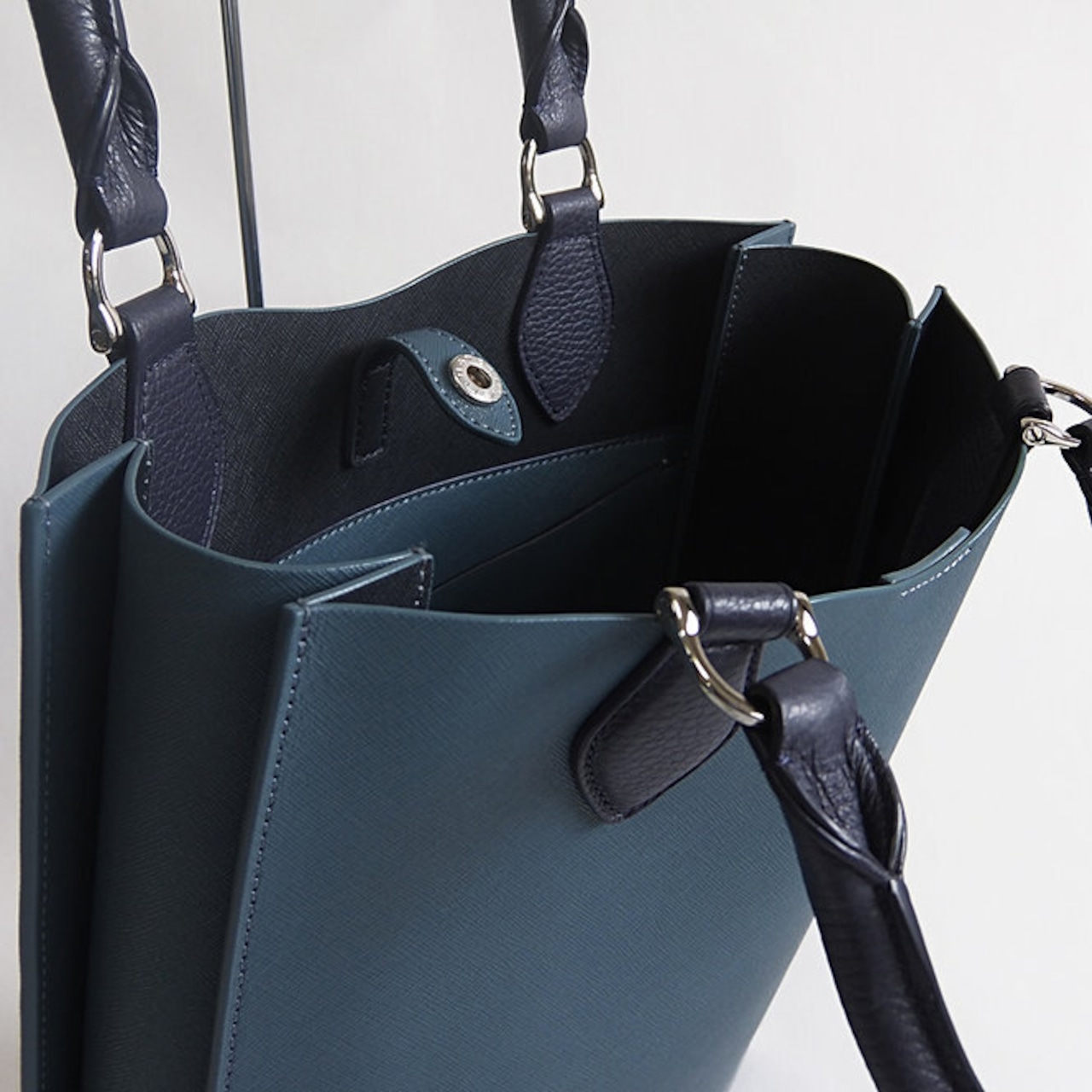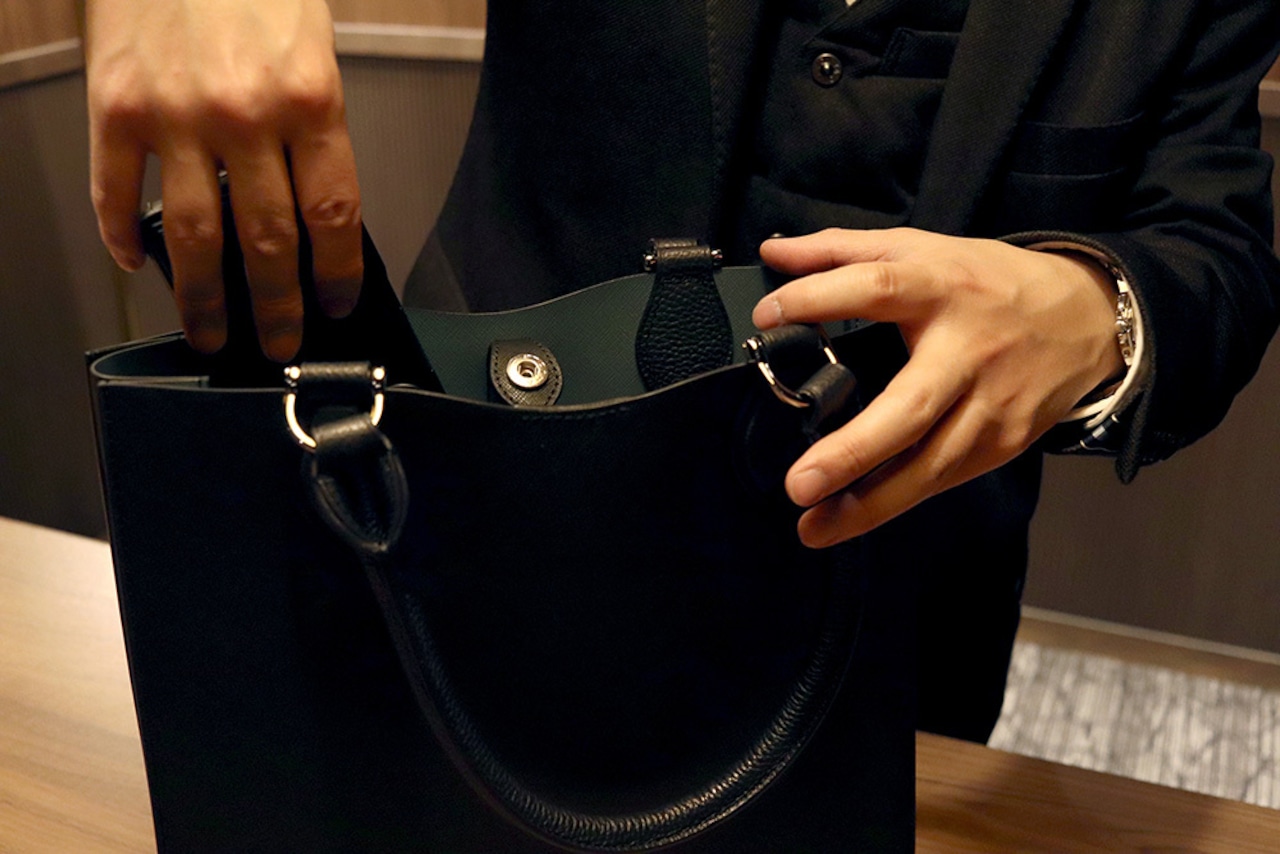 一枚仕立てながらも外装には携帯TEL・パスケース・財布等の様々な物を収納頂ける安心のファスナーポケット(こちらにもマチを付けておりますので、スムーズに取り出し出来ます)を、内装にも手帳や名刺入れ等を収納頂けるポケットを配置したビジネス仕様となっております。レザーの紙袋を持つ様なライト感覚でお持ち頂ける大人のゆとりを演出する新ビジネススタイルのご提案アイテムです。